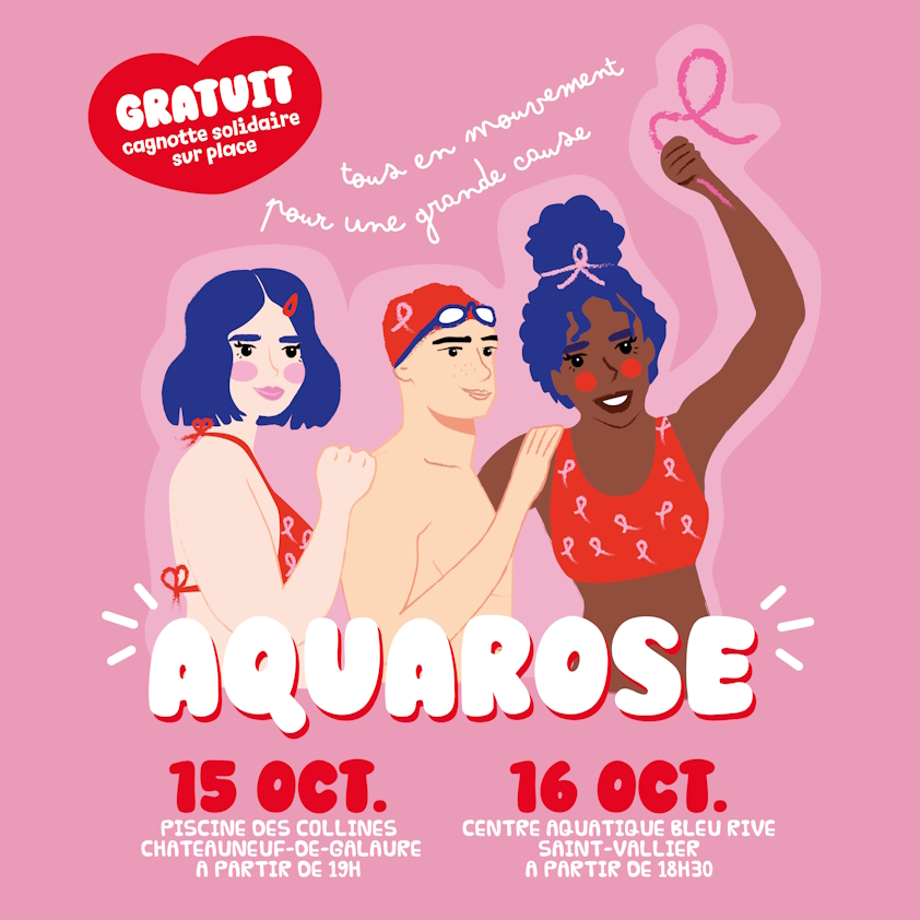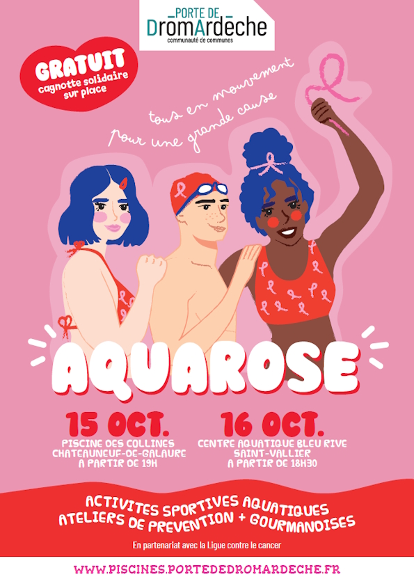 – Jeudi 16 octobre au centre aquatique Bleu Rive à Saint-Vallier pour une séance d’aquatonic (18h45) suivie d’une séance d’aquatraining (20h).